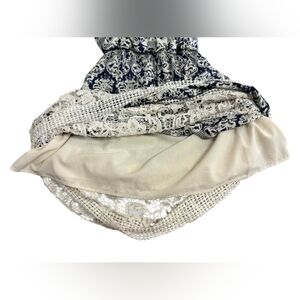 Maxi tank style dress Lacey tiered sections cross over breast line smocked under the breast white and blue in colouring has a slip