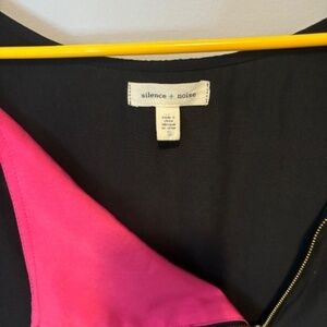 Elevate your style with this chic black and pink tunic from silence + noise. The dolman sleeves and zipper detail add a modern edge to this 80s-inspired piece. Made from polyester, this tunic is perfect for any season and features a comfortable round neckline and a pullover closure. Hand wash only for best care. Perfect for a casual day out or a night on the town, this tunic is a versatile addition to any wardrobe. This tunic is in good used condition. There is a little piling, reflected in the price.