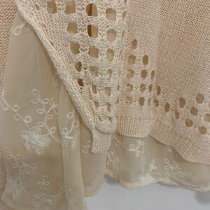 Elegant knit sweater with lace detailing. Features a stylish crochet pattern. Perfect for layering. Ptp 19, length 24