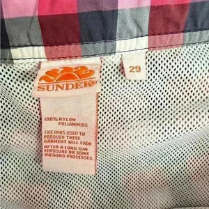 Elevate your swimwear collection with these Sundek men's swim shorts. Made from 100% nylon, these stylish shorts feature a classic plaid pattern in vibrant colors. The inner mesh lining ensures comfort and support, making them perfect for a day at the beach or by the pool. Please note that the inks used for this garment may fade after prolonged sun exposure or certain washing processes. For best care, cold hand wash, do not bleach, do not dry clean, and hang dry.