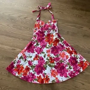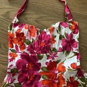 Flowered halter top dress A-line skirt Stretchy fabric Ruffled at breast, fitted at waist Ribbed at back Length of dress from top to bottom: 27.5”