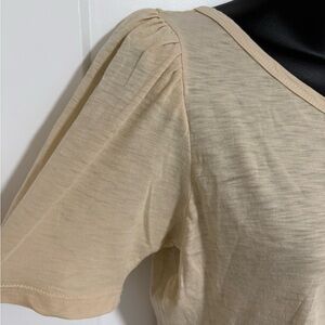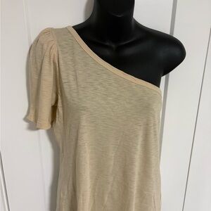 details: 100% pima cotton. Made in USA. Machine wash. One shoulder design with puff sleeve, size 1 = small
