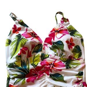 Like new, this beautiful floral bathing suit is a size small 6-8 with D Cups. Adjustable straps, ruching in the front for slimming effect, soft light support cups. See measurements.