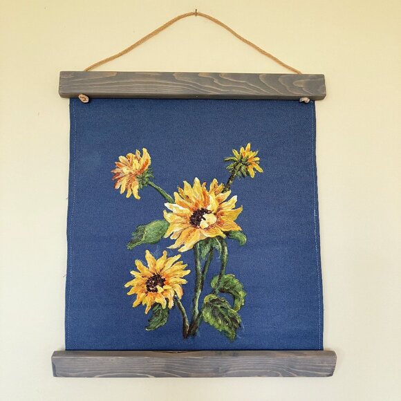 Hand painted Sunflower design on blue fabric with wooden bars at top & bottom. Top bar has jute rope attached for hanging. Blue fabric is a lighter, more muted blue shade than appears in photos (not a bright royal blue). Approx. 13" wide x 17 1/2" long when hanging (length not including rope is approx. 14 1/2"). Good pre-owned condition.