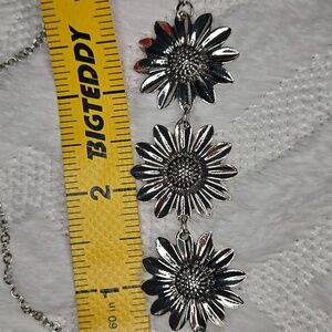 This elegant necklace features three sunflowers crafted in a shimmering silver tone.  The vintage aesthetic evokes a sense of timeless beauty.  Its art deco style adds a touch of classic sophistication. This piece would be a lovely addition to any jewelry collection.  It makes a perfect gift for those who appreciate unique and artistic design.