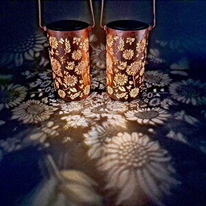 This is a set of two solar-powered outdoor lanterns featuring a decorative sunflower theme.
