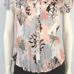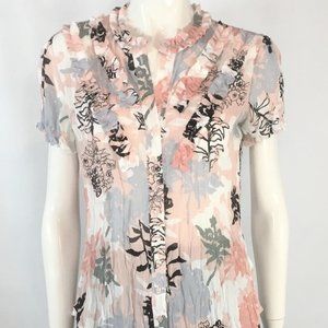 Excellent condition. Semi-sheer crinkle blouse in peach, black, grey and soft blue on white. Gathered short sleeves. Ruffle detail. Button front.