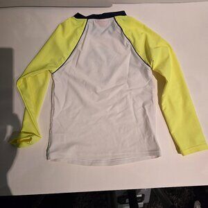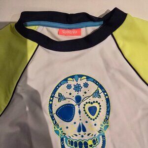 White and neon yellow sun protective top for boys by Sunuva, with navy blue trims and a blue and yellow skull print. It is made in silky-soft, regenerated nylon, with UPF 50+ protection, validated by The British Skin Foundation.
