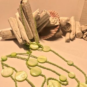 Super Cute Green Beaded Long Necklace that can be worn Long or doubled up. This necklace is in excellent used condition. Please see attached photos to confirm condition.