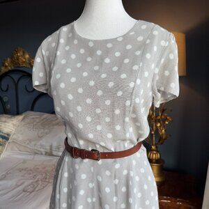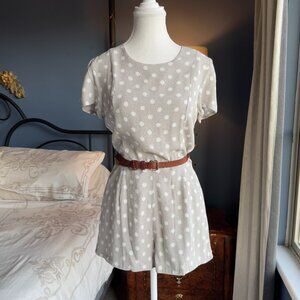 Greige (beige + grey) with white polka dots short sleeved romper, size S from Forever 21. Crepe material with lining, zipper at back. Excellent used condition. Bust measures 17.25 inches laying flat, waist measures 13.75 inches flat, hips 18 inches flat, length from shoulder to hem is 28.25 inches at the front and 30 inches at the back. Belt not included, only used to show how I usually styled it. Cat friendly, nonsmoking home.