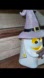 Charming ghost figurine with a glittery purple witch hat. Features a 'Boo' sign and glowing yellow eyes.