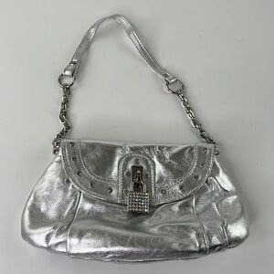 Super cute shiny silver bag with rhinestone lock. Perfect for holiday parties or those special nights out