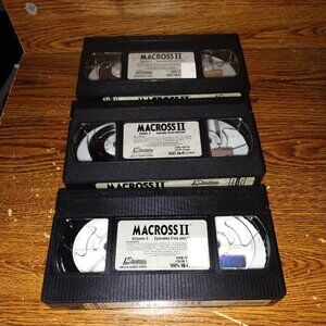 This Anime 3 VHS tape bundle is of: Super Dimensional Fortress Macross II which includes: Vol 1 to 3 and on tape 1 includes Episodes 1 and 2 on tape 2 it includes Episode 3 and 4, and on tape 3 it includes Episodes 5 and 6. This bundle is from US Renditions from 1992 to 1993. They are dubbed in English and are in pretty good condition with only some wearing on the slipcases and some sticker scum where price stickers used to be but everything seems to be in pretty good shape. They were