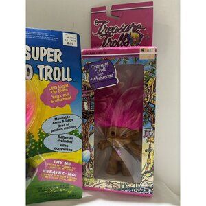 Dive into the nostalgia of the '90s with this rare, unopened Super Glow Troll & Treasure Troll Combo Pack. Both remain in excellent condition and packaging shows minimal wear with age.