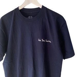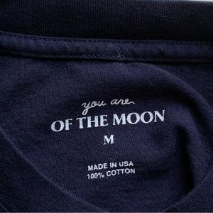 Quality cotton tee, with a large graphic on back of a woman juggling it all, and says 'SUPER MOM'. On front, the script is in French, and says 'de la lune', which translates to 'from the moon'.