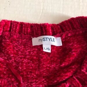 Vibrant hot pink chenille knit pullover with crew neck. Size large. I usually wear a small and it just fits baggy on me. Couple of minor pulls but nothing major. No stains.