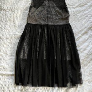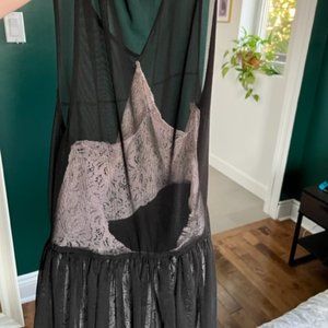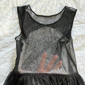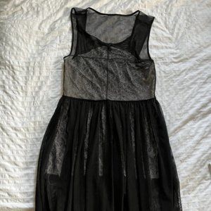 This is a sexy yet sweet dress. Sheer netted black fabric with white lace underneath in front and skirt. No lace in back of dress. Spooky!