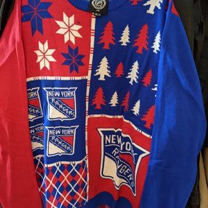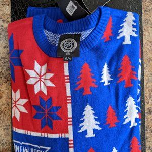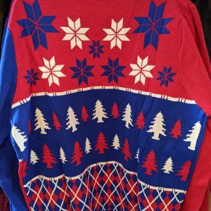 Could be used as an ugly Christmas sweater. A super soft knit, tag says XL but will fit Small up to Large and is unisex. Red Blue and Yellow Blue available.