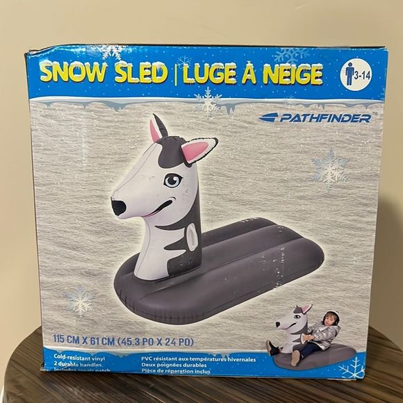 New in Box. Husky (looking) Snow Sled Has 2 handles Ages 3-14 115cm x 61cm Includes Repair Kit