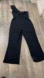 This is a pre-owned black jumpsuit featuring a one-shoulder design with a ruffle detail on the left shoulder. The jumpsuit has a fitted bodice and wide-leg pants. The material is a mid-weight crepe. Perfect for date night, evening event or cocktail party.