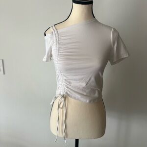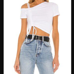 95% cotton, 5% spandex. Ruched drawstring side. Jersey fabric. Purchased from Revolve. Never Worn. Super Stretchy, wears like a crop top.