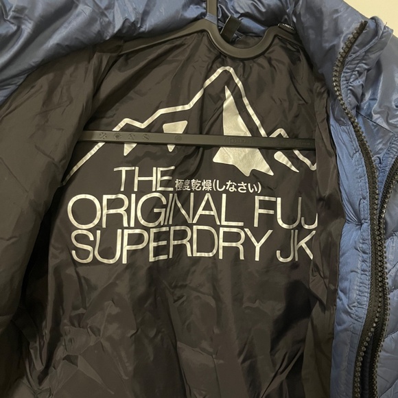 Superdry lightweight down jacket in navy blue, size small. Designed with a fitted silhouette, zip front, and zip pockets for a sleek, sporty look. In like new condition—very gently worn. Incredibly lightweight yet impressively warm, perfect for layering through fall and winter without the bulk.