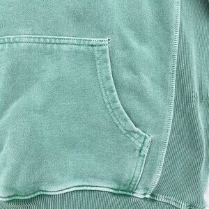 Green, 100% cotton french terry, women's size small, oversized fit. There are two small holes by the front pocket, as seen in the photos. It hasn't been worn a lot, but is a distressed style. Fairly heavy weight sweatshirt.