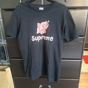 Black tee featuring a pink elephant and 'Supreme' logo.