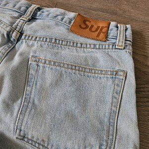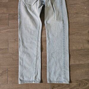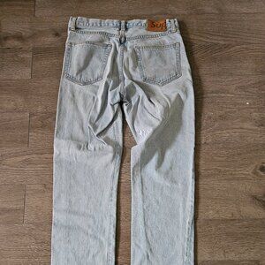 Worn and washed, has some fading and a little orange stain on one of the pant legs
