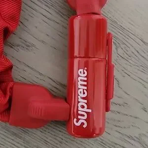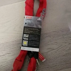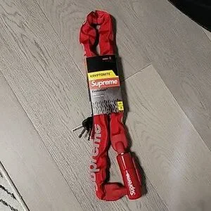 Manganese Steel, 10 mm six-sided chain link with hardened dead bolt. Pick and drill resistant disc-style cylinder. Weather-resistant nylon sleeve with reflective printed logos. 39.3" Made exclusively for Supreme.