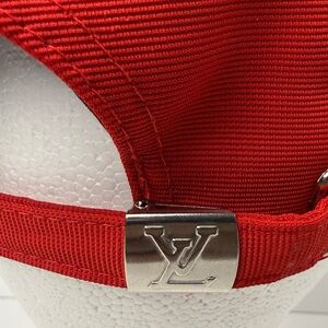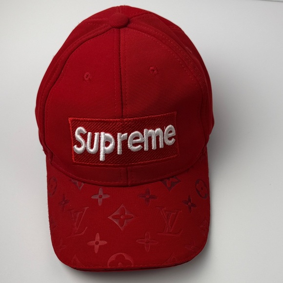 Bold red cap with iconic Supreme logo. Features stylish monogram pattern.