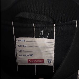 Chinese word on the front. Stylish black jacket with white stitching. Good condition.