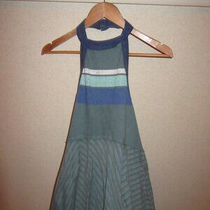 Features: Soft cotton-blend, halter-style with a bold open-back, exposed seam detailing, flowy skirt with a scalloped hem