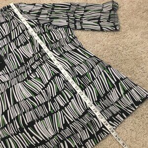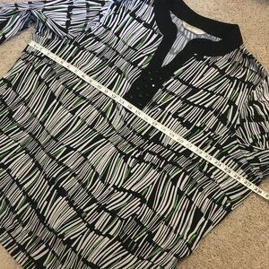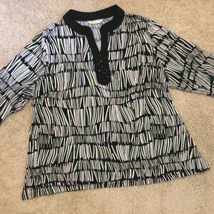 Good preowned vintage condition, stretchy, 3/4 sleeve tunic style shirt featuring the coolest pattern in black, white and lime green by Allison Daley (II?). Not sure how to describe it. It looks like a wonky surreal view of a wizard's bookshelf. Maybe damaged by water or too much potion consumption. Very Tim Burtonesque and whimsical. The black rhinestones give this piece a charming whimsigoth edge.
