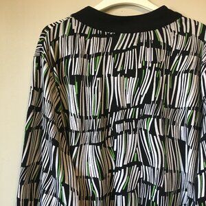 Good preowned vintage condition, stretchy, 3/4 sleeve tunic style shirt featuring the coolest pattern in black, white and lime green by Allison Daley (II?). Not sure how to describe it. It looks like a wonky surreal view of a wizard's bookshelf. Maybe damaged by water or too much potion consumption. Very Tim Burtonesque and whimsical. The black rhinestones give this piece a charming whimsigoth edge.