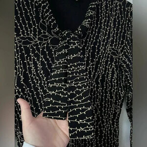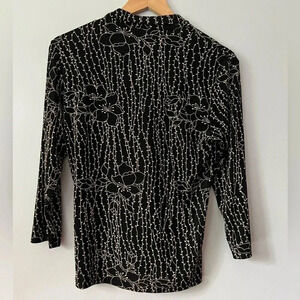 In excellent, clean condition. Black with beautiful gold embroidered vines and flowers. Tie-neck and 3/4 sleeves. Nylon/spandex blend, nice and stretchy.