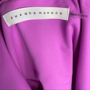 Features: Susana Monaco, cinched waist, strapless mini dress, ruffle hem, ribbon and bow waist, fuchsia, pink, bubble, detachable belt, party, evening, prom, cocktail, wedding, bridesmaid, party, Christmas, New Year’s Eve, clubbing