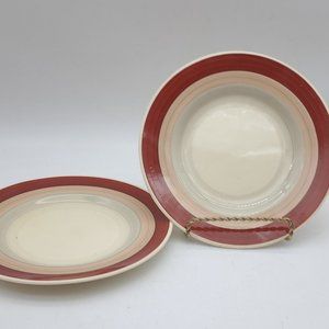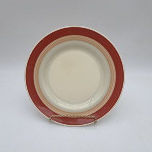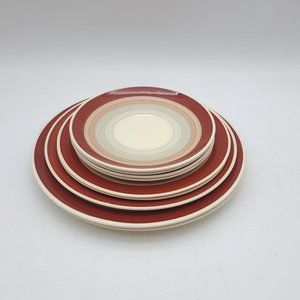 9 pieces of Susie Cooper dishes made in England between 1932 and 1964; they are very similar to the Wedding Ring pattern but are not identical. The dishes are decorated with a maroon band along the edges with beige and green bands towards the center, There are 2 dinner plates, 1 smaller plate, 2 side plates and 4 saucers. There are no chips or cracks but there is crazing and scratches from use.