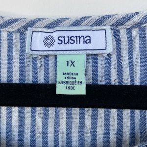 Very cute summer top from Susina. Uneven (on purpose) ruffle along the hem 100% Cotton Excellent condition See photos for approximate measurements