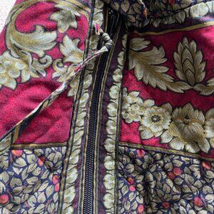 Beautiful Suttle & Seawinds overnight bag, gently used in perfect condition, no tears or rips. Designed by Vicki Lynn Bondon, Mahone Bay, Nova Scotia. Bag is dark green with apples & leaves pattern in centre of bag with cranberry/shades of green on both ends. 100% cotton, machine wash gentle & cool. Bag measures 25"W x 9"D, has a 20" zipper with a 6"tie & two 20" shoulder straps, each 1 1/2"W. Tab on front "Shuttles & Seawids - Hand Made in Nova Scotia". All measurements are approximate & smoke-free home.