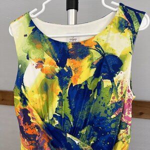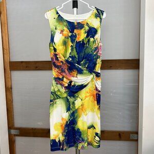 Suzy Chin x Maggie Boutique Multicolor Abstract Ruching Gathered Waist Lined Sleeveless Midi Sheath Dress Sz 10