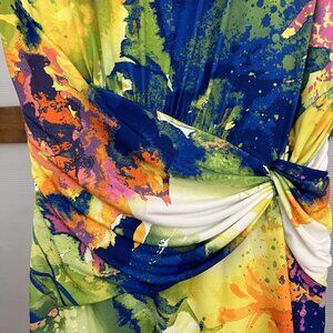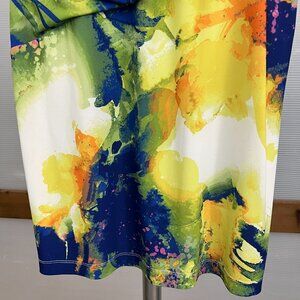Standout in this splashy multi color abstract print in blue, yellow, orange green & white. Ruche waistline for a flattering silhouette.