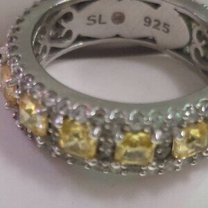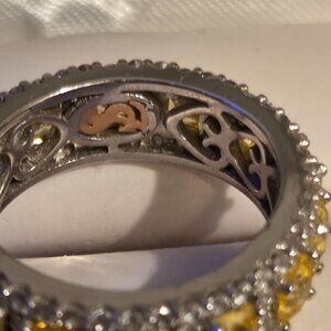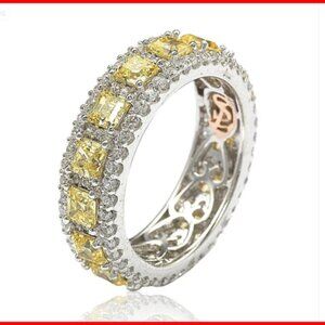 A delicious mix of colors that will last an eternity. This ring is filled with rich, tasteful color and modern fashion, featuring tasty yellow asscher-cut cubic zirconia, prong-set between two rows of white pave cubic zirconia, hand set in 925 sterling silver. Surprise someone special in your life with this luxurious anniversary ring. Yellow and white round and asscher-cut gemstones set in high-polish sterling silver setting create a ring that's not only strikingly gorgeous but reminds your special someone that your love lasts for all eternity. This ring is designed by Suzy Levian with a message. By creating jewelry that is beautiful inside and out, Suzy Levian's message is revealed through a hidden gemstone set in the shank of this ring to empower women to discover their inner strength, power and beauty. This ring has a closed under-gallery for comfort fit with a two-tone setting, highlighting Suzy Levian's SL logo. 'Together we can inspire the world to appreciate the diamond in ourselves.' - Suzy Levian