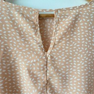 Falling leaves print in white on coral pink back drop. Dolman batwing slit sleeves. Ballet neck. Wear with arms through the shoulder or sleeve opening based on your fancy. Keyhole back. Bow tie front hem.
