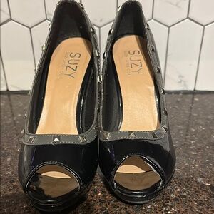 Sleek black patent heels with edgy studs. Perfect for a bold statement.