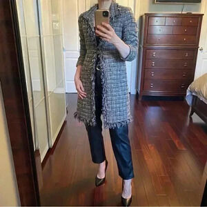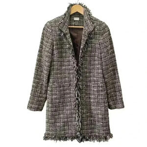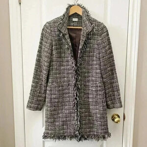 Suzy Shier Blazer Topper Coat Brown Metallic Plaid Tweed Fringe Trim Duster XS