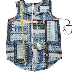 Suzy Shier Blue Geometric Zellige Print Boho Sleeveless Top with Shirring Size M