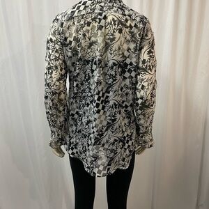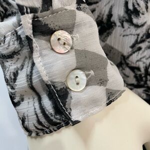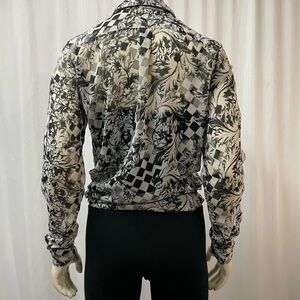 This blouse is semi sheer and can be worn a number of ways. I styled it on the mannequin with the front tied, and untied to show how far it comes down at the back. The sleeved also have buttons at the elbows so that they can be converted to 3/4 length. Size small.
