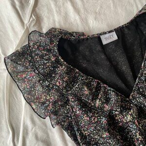 🍃 cottagecore fairy boho floral sheer v-neck midi dress with ruffle detailing and wrap around waist. a dainty and feminine piece!