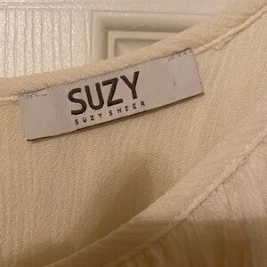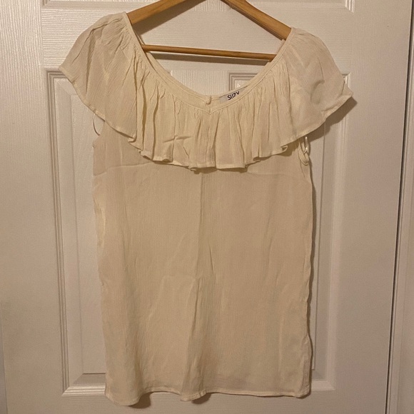 Chic cream blouse with elegant ruffle neckline. Perfect for versatile styling.